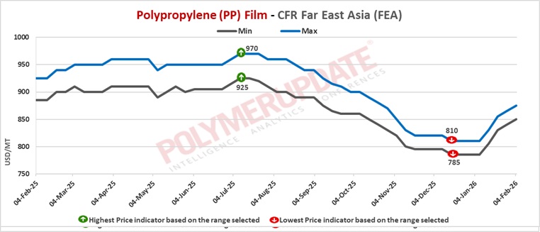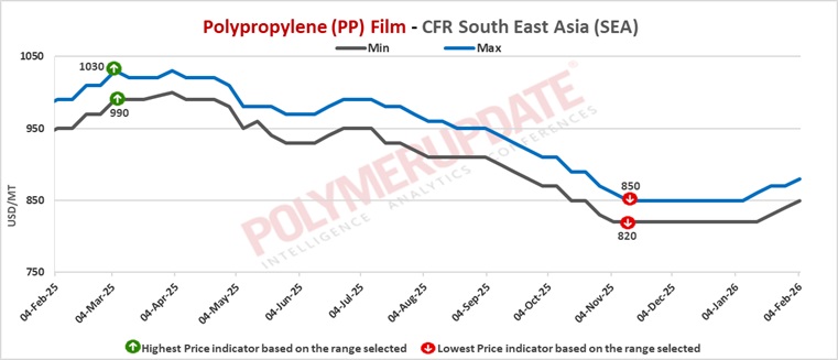 In South East Asia, PP raffia and PP injection grade prices were assessed at USD 820-840/mt CFR levels, both increased by USD (+10/) from the previous week. PP film prices were assessed at USD 850-880/mt CFR levels while BOPP prices were assessed at USD 830-860/mt CFR levels, both week-on-week increased by USD (+10/mt). PP block copolymer prices were assessed at USD 860-880/mt CFR levels, up USD (+10/) from last week.