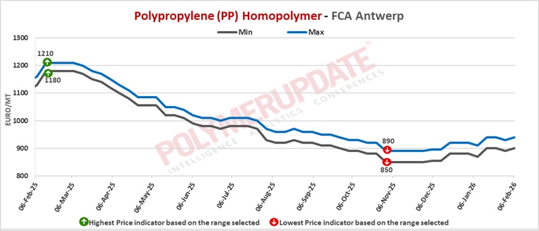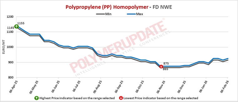 An industry source in Europe told a Polymerupdate team member, “The European polypropylene market recorded higher spot prices as tighter supply put upward pressure on the market. Demand remained weak, with no clear signs of a meaningful improvement in sentiment for February, limiting price gains. Recent price movements have largely been driven by supply-side factors, as imports of both homopolymer and copolymer polypropylene continued to decline, reducing the availability of lower-priced material. Cheaper offers gradually disappeared, allowing suppliers to push for firmer pricing. Overall demand levels remained unchanged, but market participants increasingly sought to stabilize and strengthen prices.”