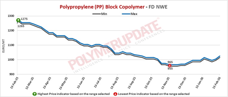 PP block copolymer grade prices were assessed at Euro 1405-1410/mt FD NWE Germany and FD NWE France levels, both steady week-on-week. PP block copolymer grade prices were assessed at Euro 1395-1400/mt FD NWE Italy levels, unchanged from the previous week. Meanwhile, PP block copolymer grade prices were assessed at GBP 1220-1225/mt FD NWE UK levels, week-on-week marginally higher by GBP (+5/mt).