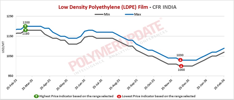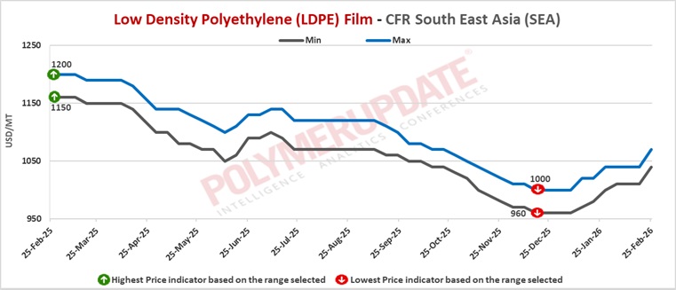 In South East Asia, LDPE film grade prices were assessed at USD 1040-1070/mt CFR levels, a week-on-week increase of USD (+30/mt).