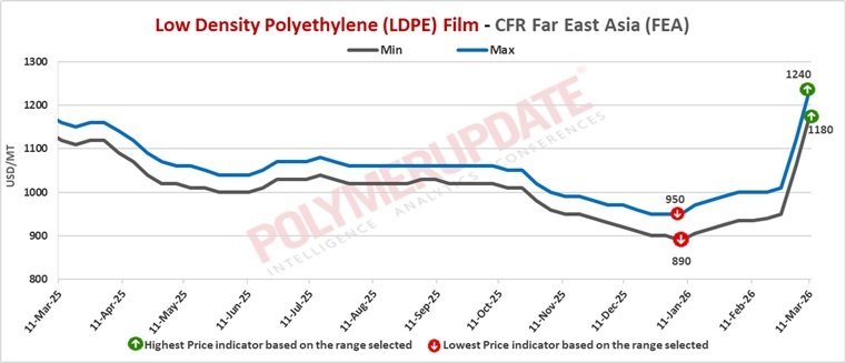 In Far East Asia, LDPE Film prices were assessed at USD 1180-1240/mt CFR levels, a spike of USD (+120/mt) from the previous week.