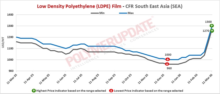 In South East Asia, LDPE Film prices were assessed at USD 1270-1300/mt CFR levels, a steep week-on-week increase of USD (+120/mt).