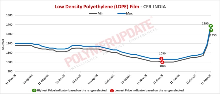In India, LDPE Film prices were assessed at USD 1350–1390/mt CFR levels, a sharp week-on-week increase of USD (+180/+200/mt). The rise followed four consecutive price hikes announced by a domestic Indian producer since early March 2026, taking the cumulative increase to Rs.47/kg basic, reflecting firmer sentiment in the regional market.
