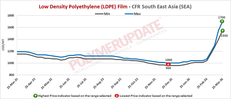 In South East Asia, LDPE Film grade prices were assessed at USD 1550-1700/mt CFR levels, a steep gain of USD (+150/mt) from the previous week.