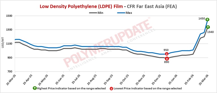 In Far East Asia, LDPE Film grade prices were assessed at USD 1340-1450/mt CFR levels, week-on-week sharply higher by USD (+140/+190/mt).