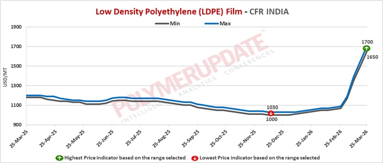 In India, LDPE Film grade prices were assessed at USD 1650-1700/mt CFR levels, a surge of USD (+150/mt) from last week.