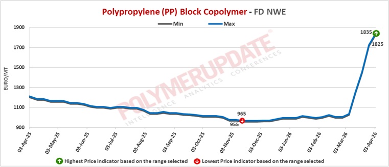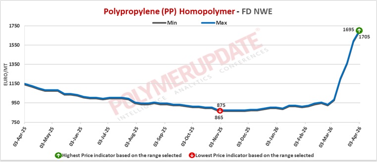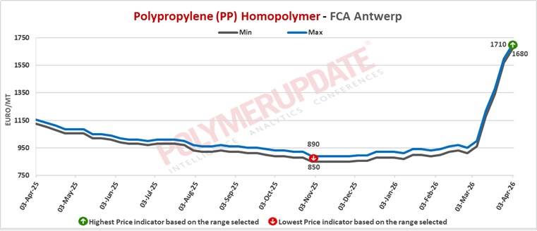 An industry source in Europe told a Polymerupdate team member, “European PP spot prices moved higher as tightening supply and elevated feedstock costs continued to support the market. Reduced inflows from West Asia, combined with container shortages in the Middle East and the diversion of naphtha cargoes to Asia, constrained regional availability. Upstream pressure intensified further with the April propylene contract settling at a sharply higher level, pushing production costs up and enabling producers to maintain firm offer levels. Limited import options and restricted domestic supply left converters with reduced allocations, leading to selective buying at elevated prices, while overall demand remained cautious amid the higher-cost environment.”