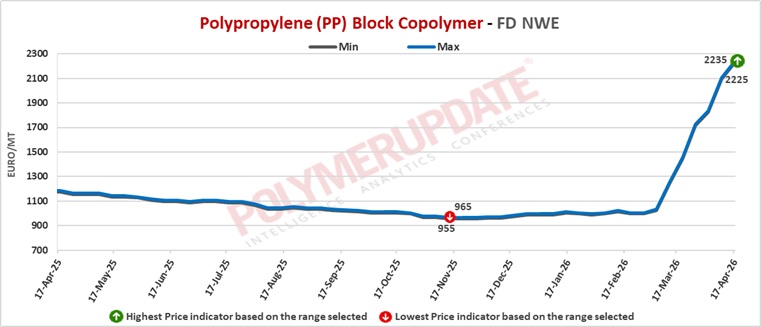 PP block copolymer grade prices were assessed at Euro 2300-2305/mt FD NWE Germany and FD NWE France levels, both surged Euro (+350/mt) from the previous week. PP block copolymer grade prices were assessed at Euro 2290-2295/mt FD NWE Italy levels, a steep week-on-week rise of Euro (+350/mt). Meanwhile, PP block copolymer grade prices were assessed at GBP 2000-2005/mt FD NWE UK levels, a spike of GBP (+305/mt) from last week.