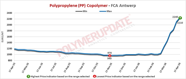 In Antwerp, PP homopolymer prices were assessed at Euro 2080-2110/mt FCA levels, a sharp rise of Euro (+100/mt) from the previous week, while PP copolymer prices were assessed at Euro 2210-2240/mt FCA levels, a spike of Euro (+130/mt) from last week.