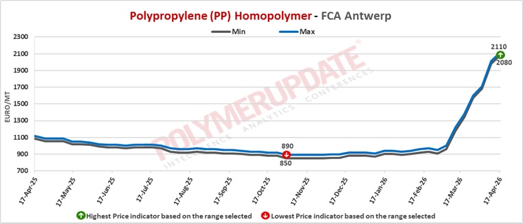 An industry source in Europe told a Polymerupdate team member, “European PP prices moved higher as limited spot availability lifted both contract and spot levels beyond the propylene increase. Buyers reported reduced allocations unless higher prices were accepted. Imports from Egypt and the U.S. were discussed, but restricted availability capped inflows. Ongoing Middle East tensions, including shipping disruptions in the Strait of Hormuz that have led to rising logistics costs, continued to support firm market sentiment.”