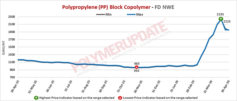 PP block copolymer grade prices were assessed at Euro 2410-2415/mt FD NWE Germany levels, unchanged from the previous week, while PP block copolymer grade prices were assessed at Euro 2410-2415/mt FD NWE France levels, week-on-week flat. Meanwhile, PP block copolymer grade prices were assessed at Euro 2400-2405/mt FD NWE Italy levels, unchanged from last week, and PP block copolymer grade prices were assessed at GBP 2090-2095/mt FD NWE UK levels, holding steady from the previous week.