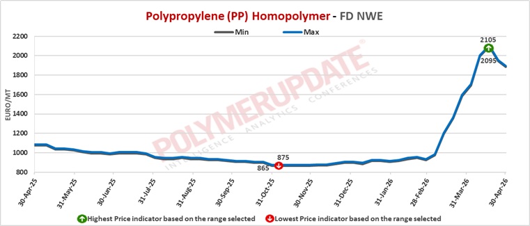 In the spot markets, PP injection moulding grade prices were assessed at Euro 1885-1895/mt FD North West Europe levels, a steep drop of Euro (-60/mt) from last week. PP block copolymer grade prices were assessed at Euro 1945-1955/mt FD NWE levels, slipping by Euro (-40/mt) from the previous week.