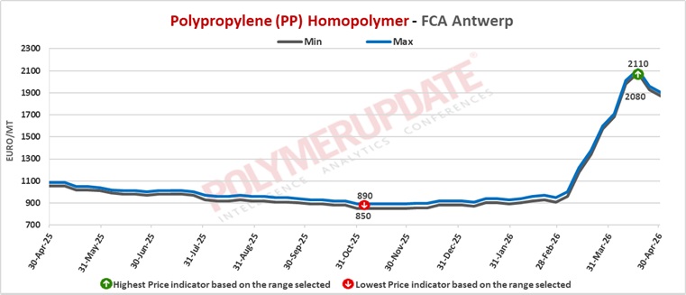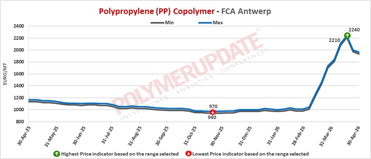In Antwerp, PP homopolymer grade prices were assessed at Euro 1870-1900/mt FCA levels, declined by (-60/mt) from last week, while PP copolymer grade prices were assessed at Euro 1930-1960/mt FCA levels, week-on-week lower by (-40/mt).