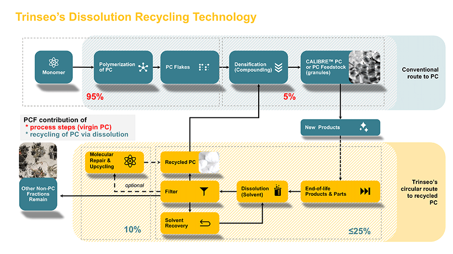 Figure 2: Process schematic comparing the conventional fossil-based route to polycarbonate with Trinseo’s circular dissolution-based recycling route. Highlighted here is the contribution of individual process steps to the polymer carbon footprint (PCF), showing how end-of-life PC products are selectively dissolved, purified and optionally upgraded through molecular repair before re-entering compounding and product manufacturing. High solvent recovery and polymer retention enable a substantial reduction in PCF compared with virgin PC production.