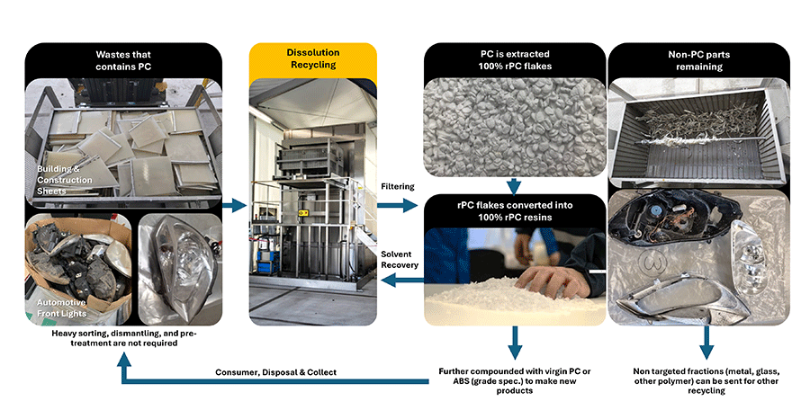 Figure 3: Trinseo’s dissolution-based recycling process for polycarbonate-containing waste streams, including building and construction sheets and automotive lighting parts. Polycarbonate is selectively dissolved and recovered as high-purity rPC flakes and resins, while non-PC components remain undissolved and are separated for appropriate downstream recycling. The recovered rPC can be directly reused or compounded with virgin PC or ABS to produce new products, without the need for intensive pre-sorting or dismantling.