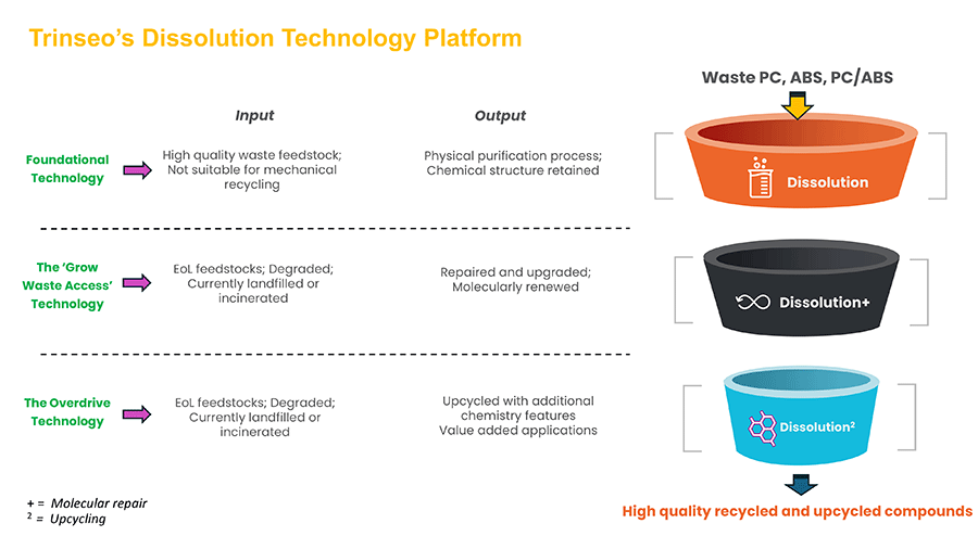 Figure 6: Overview of Trinseo’s dissolution-based recycling technology platform applied to waste PC, ABS and PC/ABS streams. The foundational dissolution process enables physical purification while retaining chemical structure, whereas advanced variants incorporate molecular repair and upcycling to renew degraded polymers or introduce additional functionality, expanding feedstock flexibility and value creation.