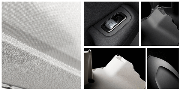 Figure 7: Examples of automotive interior parts produced using PC, ABS and PC/ABS compounds incorporating dissolution-recycled content. The images highlight fine surface textures, consistent grain replication and high aesthetic quality, confirming suitability for visible interior applications.