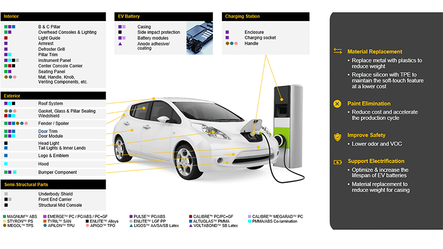 Figure 9: Trinseo's recycled content containing product offerings present opportunities for material substitution, paint elimination, improved safety through reduced VOC emissions, and weight reduction to support vehicle electrification and circular material solutions.