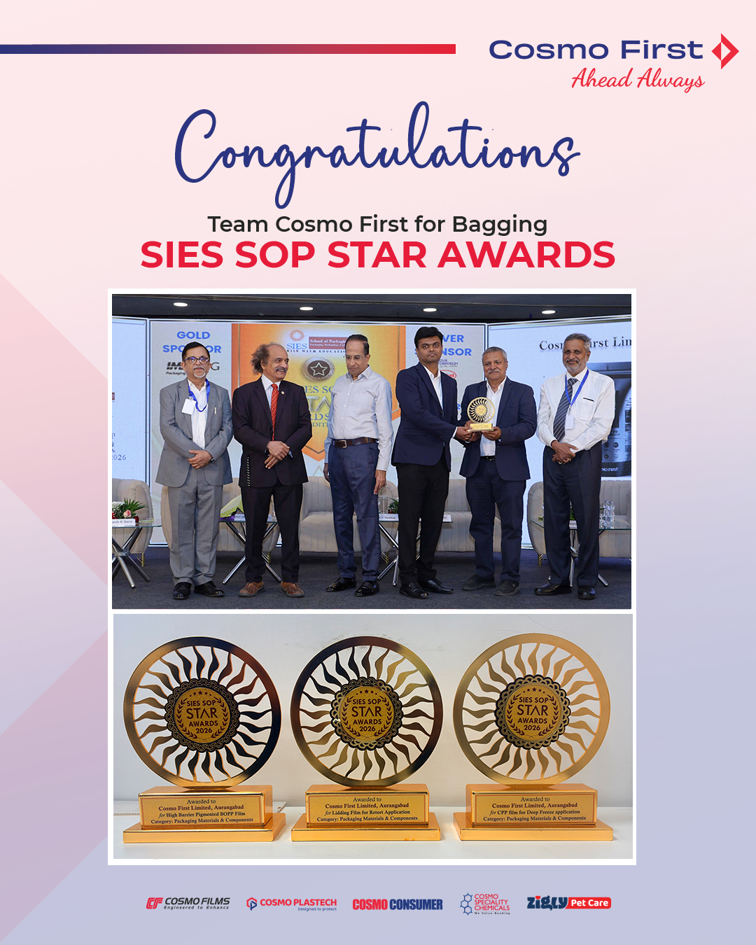 Cosmo Films, a global leader in specialty films, has been honoured with three SIES SOP Star Awards 2026 in their 9th edition, under the Packaging Materials & Components category. The awards were presented on March 17, 2026, recognizing the company’s continued excellence in developing high-performance, application-driven packaging solutions.