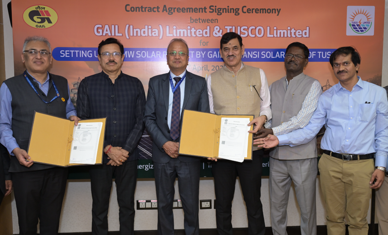 GAIL (India) Limited, India’s integrated energy major, signed contract agreements with M/s TUSCO Limited for setting up of 600 MW of solar power project at TUSCO’s Solar Park located at Jhansi in Uttar Pradesh. The contract agreements were signed by Shri Parivesh Chugh, Executive Director , GAIL (India) Limited and Shri Anil Tyagi, CEO, TUSCO Ltd. in the presence of Shri R K Singhal, Director, GAIL (India) Limited, Shri Neeraj Verma, Executive Director, THDC and other senior officials from both the companies.