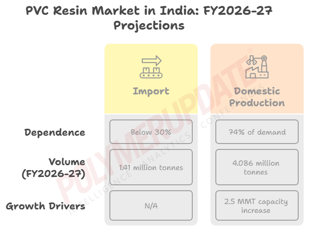 The study indicates that India’s PVC import dependence is expected to stand at 1.41 million tonnes, approximately 26 percent of the anticipated total demand of 5.496 million metric tonnes (MMT) in FY 2026-27. Domestic production is set to meet the remaining 74 percent of demand, with a record volume of 4.086 million tonnes.