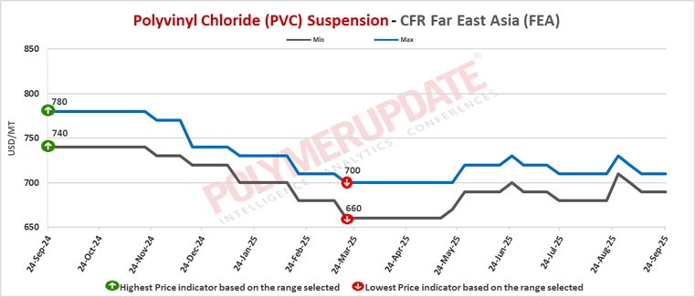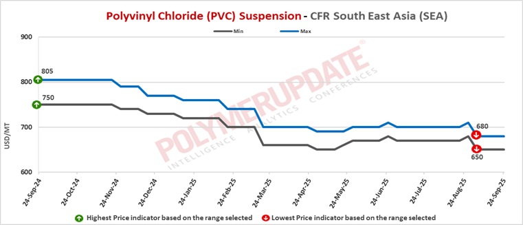 In South East Asia, a producer from Taiwan has offered its PVC resin suspension grade at the USD 670-680/mt levels, for shipment in October 2025.