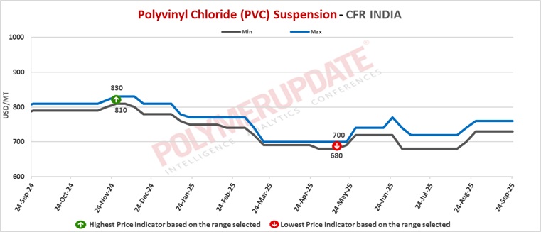 A major Taiwanese producer has offered its PVC suspension grades (S65D/S65/S60/S70/B57) at the USD 760/mt levels on CIF Nhava Sheva/Mundra/Chennai ports basis with shipment for October 2025 (LC at sight). These offers have been rolled over from the previous month's offers.