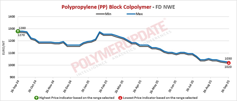 An industry source in Europe informed a Polymerupdate team member, "The European polypropylene (PP) market faced pressure in September, as prices continued to decline due to ongoing weak demand. Market participants had anticipated a seasonal resurgence throughout the month; however, the expected recovery did not occur. A trader stated that the typical September restocking did not occur this year, leading to an oversupply. Due to subdued buying interest, spot prices slipped as producers found it hard to achieve sales at elevated rates. The decline closely followed the softness in homopolymer injection grade, where prices decreased as anticipated, while premiums stayed largely consistent.”