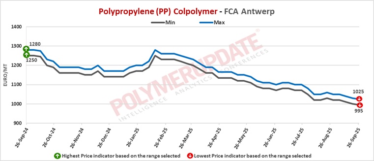 FCA Antwerp PP homopolymer prices were assessed at the Euro 900-940/mt level, a decrease of Euro (-10/mt) from the previous week, while FCA Antwerp PP copolymer prices were assessed at the Euro 995-1025/mt levels, a fall of Euro (-5/mt) from last week.